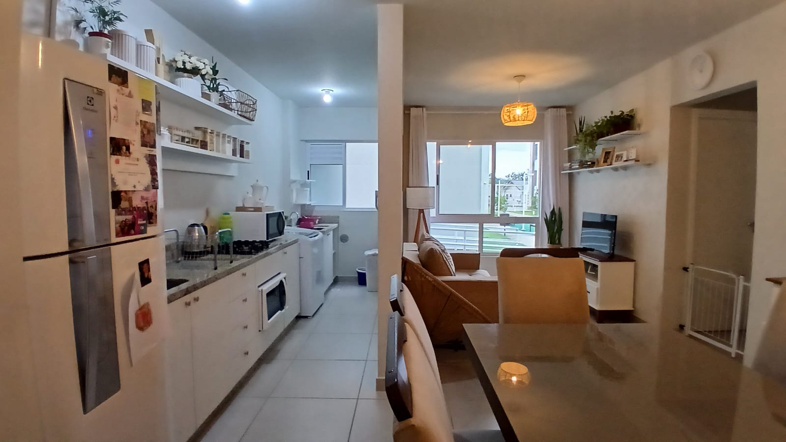 -Sala de estar e jantar integradas à cozinha.