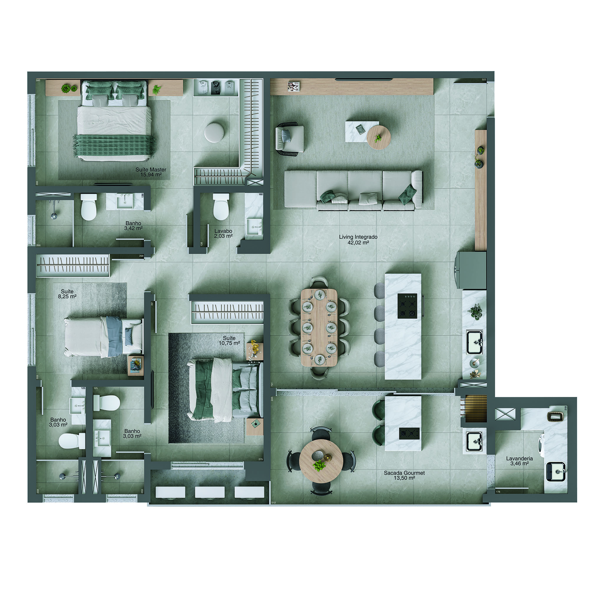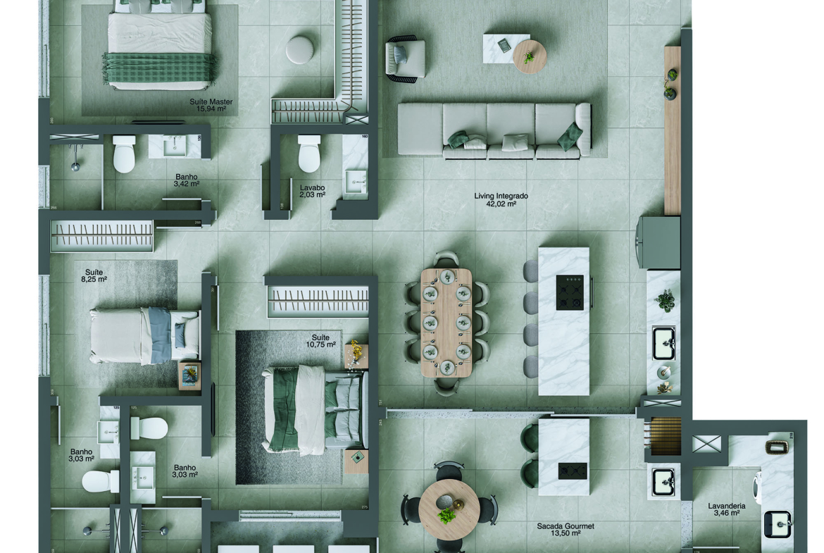 – Plantas de 125 m² e 132 m² de área privativa